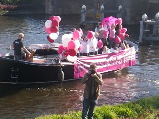 Een half uur voor de wedstrijd begin ik mijn eerste wedstrijdspanning een beetje te voelen. Het werd tijd. Tot vlak daarvoor moest ik me er nog een beetje toe zetten. Heb ik er wel zin in? Het eerste stukje is een rondje en ik besluit deze te gebruiken om het lichaam warm te laten lopen en even te testen. Als het niet goed gaat stap ik daar uit. Gelukkig geeft het lichaam aan dat het wel wil. De eerste 15 km gaan in een roes voorbij. Het is oppassen geblazen op want de weg is niet bepaald vlak. Ik zie op tegen de Amstel want dat lijkt me nogal saai. Niets is minder waar. Ik vind het zelfs het mooiste stukje van de wedstrijd. Ergens op het eerste stuk komt Jan achterop. Huh? die liep toch voor mij? Even kletsen, fotootje gemaakt en Jan laten gaan. We lopen onze eigen race en Jan had hogere ambities dan ik. Mijn doel voor de dag is uitlopen binnen 4 uur. Dus heel relaxed. De Amstel is erg leuk. Op het water roeiers (leuk Janna) en schepen met daarop wat bandjes met muziek. De sfeer zit er goed in. Op het eind van de Amstel ligt een schip met allemaal roze meiden erop. De tekst is uitnodigend. ” Come sleep with me” Tja, Amsterdam he. Totdat ik lees Mercury hotel.
