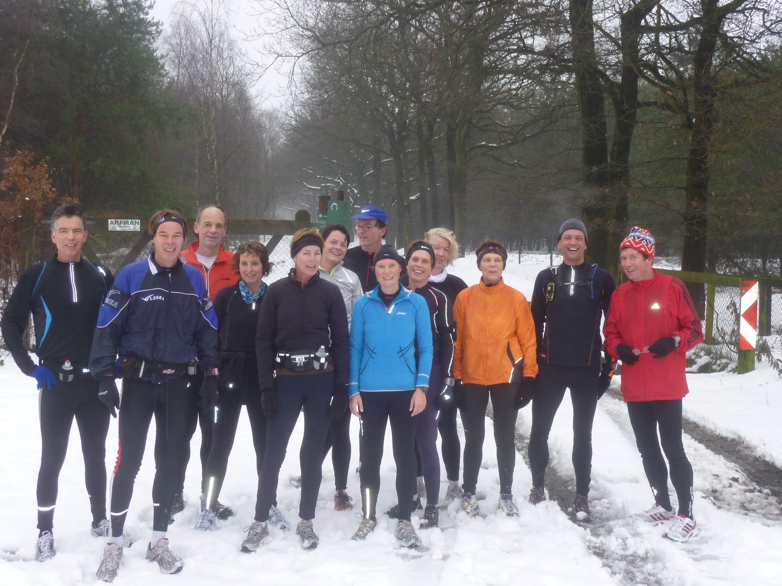 Was het vorig jaar de halve van Egmond die werd geannuleerd nu is het de Montferlandrun die niet doorgaat. De motivatie weet ik niet maar als je kijkt naar het weer en de sneeuw ligt de reden voor de hand. En net als vorig jaar is er een groepje die dan behoefte heeft aan een alternatief. De energie moet er toch uit. De opkomst is best groot als je nagaat dat het nieuws pas gisteren laat bekend werd. Èn méér dames dan heren. Op de foto zie je dat de heren daar beschermend omheen gaan staan maar waarom? De route gaat door de veluwezoom. Helaas dooit het dus het is vieze pap op de paden. In het bos valt het nog mee met enkel diepe sneeuw. Dit levert weer andere problemen op. Het aantal trailschoenen in de groep stijgt. Van de 13 zijn er 3 met de winterbanden onder de voeten. Met deze schoenen is het toch net effe makkelijker lopen. In de groep zijn een aantal die ik verdenk binnenkort ook op dit type schoen te verschijnen. Doen! Krijg je geen spijt van. Een andere beslissing die ik hoor is het inschrijven voor winterloopjes. Voortaan alleen nog maar na-inschrijvingen als ik het zo hoor. Niet onverstandig lijkt mij.