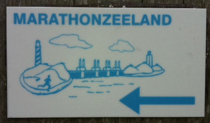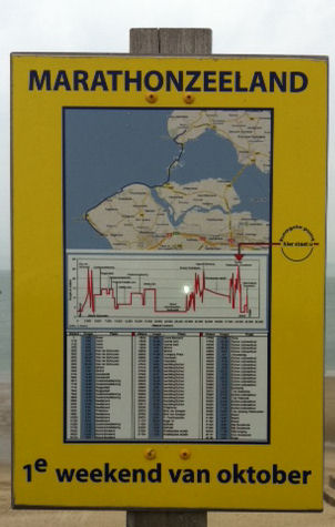 Daar klim ik het duinpad op en volg de Zeelandmarathon route. Simpel te doen want de route staat nu al keurig met bordjes aangegeven. Op het hoogste punt staat nog een bord met getijdeinformatie. Alles in het teken van de Marathon. Stiekem kijk ik op de website. Zal ik een startnummer overnemen?
