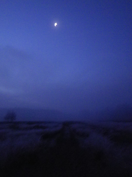 Ik ben om kwart voor 7 in het bos. Nog niet simpel om daar te komen want het is echt heel donker. Ik kan mijn voeten niet zien laat staan het pad. In het “vieze bosje” lukt het mij om twee keer verkeerd te lopen. In het bos hangt een spannende sfeer. Donker en mist. Orienteren doe ik nu met andere zintuigen. Na een minuut of 10 loop ik zodoende op tegen een muur van wild-geur. Het kan niet anders dan dat er vlak voor mijn neus een groep herten is gepasseerd. Ik heb ze niet gezien.