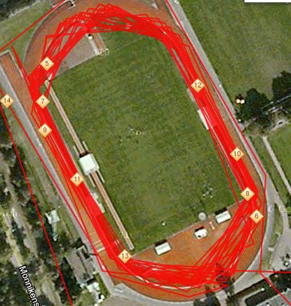 Donderdag staat een 15*200 en 15*100 training op het programma. Wat ik over het hoofd gezien heb is dat de training op de baan wordt gegeven. Omdat ik in mijn herstelweek zit lijkt een dergelijk intervaltraining nou niet het beste recept. Ik loop de intervallen en de pauzemeters dus in één tempo op de baan! Pfeww. Het is maar goed dat ik niet goed gelezen heb anders had ik waarschijnlijk een alternatief gezocht. Tijdens de training gaat het uiteraard ook nog regenen. Gelukkig heb ik een goede waterdichte jas die de test prima doorstaat. Nog wel wat touwtjes beter stellen maar ik ben behoorlijk onder de indruk. Het levert wel een amusant patroon op google maps op. Kon ze niet helemaal goed tellen maar het zijn er een stuk of 25.
