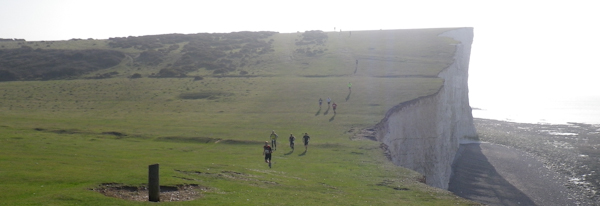De eerste 500m is vlak en dan zijn we via een bochtje en een korte klim opeens bij de kust. WOW!!!! We staan oog in oog met “The Seven Sisters”. Spectaculair!! We verliezen veel tijd want we gaan uitgebreid fotograferen. Wat een prachtige omgeving. Direct klimmen wij langs de kliffen naar de eerste top. Oh oh. Als dit bepalend is voor de wedstrijd wordt het eenzware dag! Het gaat op en neer, op en neer. We komen bij een splitsingspunt waar de 10km rechtsaf gaat. Inmiddels weten we dat de Ultra, de marathon plus de 10km is. Met andere woorden deze beklimmingen komen straks nog een keer! Aan het eind van de Seven Sisters gaan we het binnenland in.