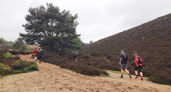 Bij het uitzichtspunt op de Posbank tegenover het Paviljoen kijken we even om ons heen. Via de Posbank gaan we over een ruiterpad met diep zacht wit zand richting de Beekhuizenseweg. Die steken we over om via nog een zandpad uit te komen op de Tunnekesweg. Langs de boerderijen verder naar het Noorden richting de Imbos. Verder en verder richting Terlet. We steken onder de A50 door en maken een rondje in Deelerwoud. Hier krijgen we te maken met stevige slagregens. We lopen door het tunneltje terug en hier staan mijn oudste twee (met vriend) ons op te wachten met de nodige versnaperingen. De cola gaat er snel dooheen. Net als de stroopwafels en repen, sinaasappels en drop. Met enige verbazing bekijkt met de NUUN tabletten.
